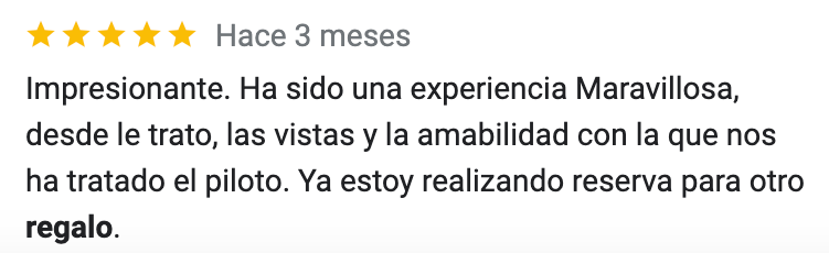 Recomiendo experiencia y la sensibilidad y profesionalidad del piloto { Marco}, que nos hizo sentir en todo momento partícipes del vuelo. Gracias, Marco eres un gran profesional.